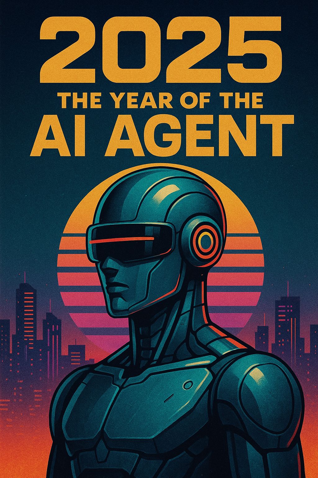 Image made with Model, GPT 4-o Prompt:A retro-futuristic digital illustration of a humanoid AI agent set in the year 2025. The AI figure has a sleek, metallic body and a smooth, visor-style helmet. The background features a neon-lit city skyline with tall buildings silhouetted against a stylized sun made of pink-orange horizontal lines. The color palette blends dark blues, oranges, and purples in a synthwave style. Bold text reads “2025 The Year of the AI Agent” in a vintage sci-fi font, completing the retro-futuristic poster design. The overall aesthetic is inspired by 1980s cyberpunk and synthwave visuals.
