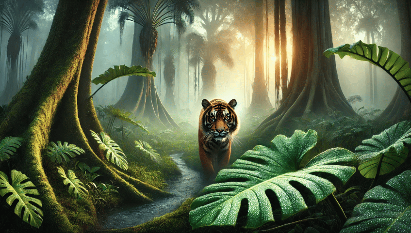 A majestic Bengal tiger with piercing amber eyes walking through a misty tropical jungle at dawn, photorealistic wildlife photography, with dewdrops on large monstera leaves and mist curling around ancient tree trunks, creating a serene yet mysterious atmosphere. Wide shot with the tiger positioned on the left side of the frame, shot with a telephoto lens.