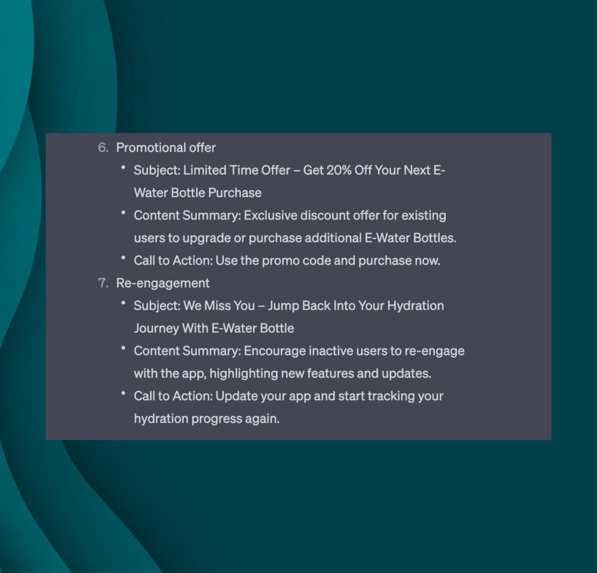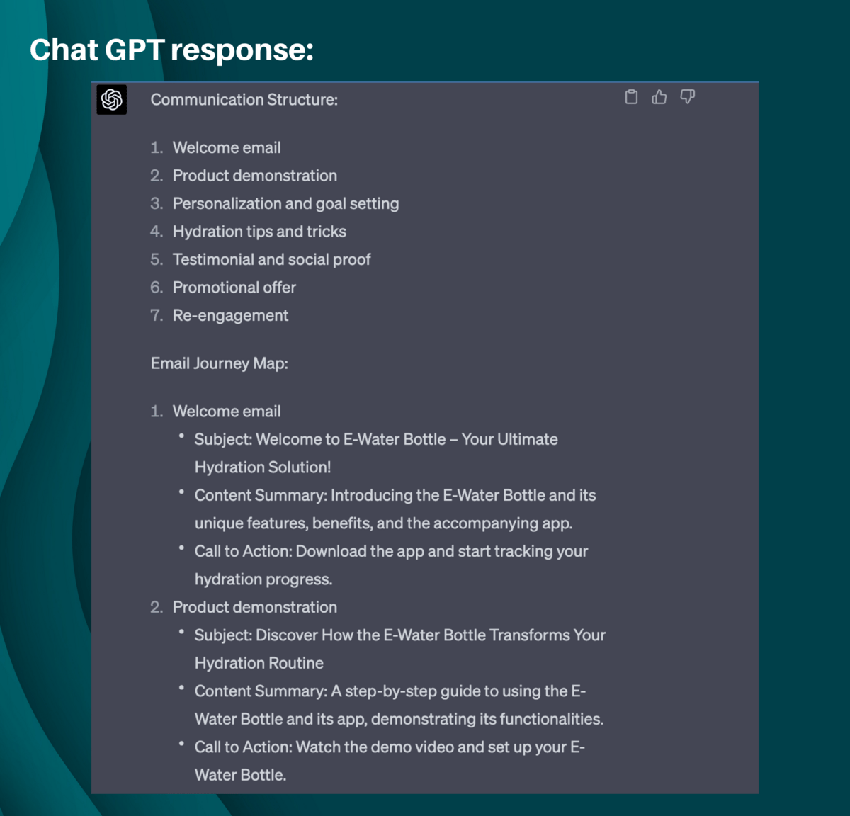 In the example we will ask Chat GPT to act as a “Marketing automation expert” The prompt is set to provide a unique output since we are providing specific information about our product, we are clear on the task needed and we are requesting a specific output.
